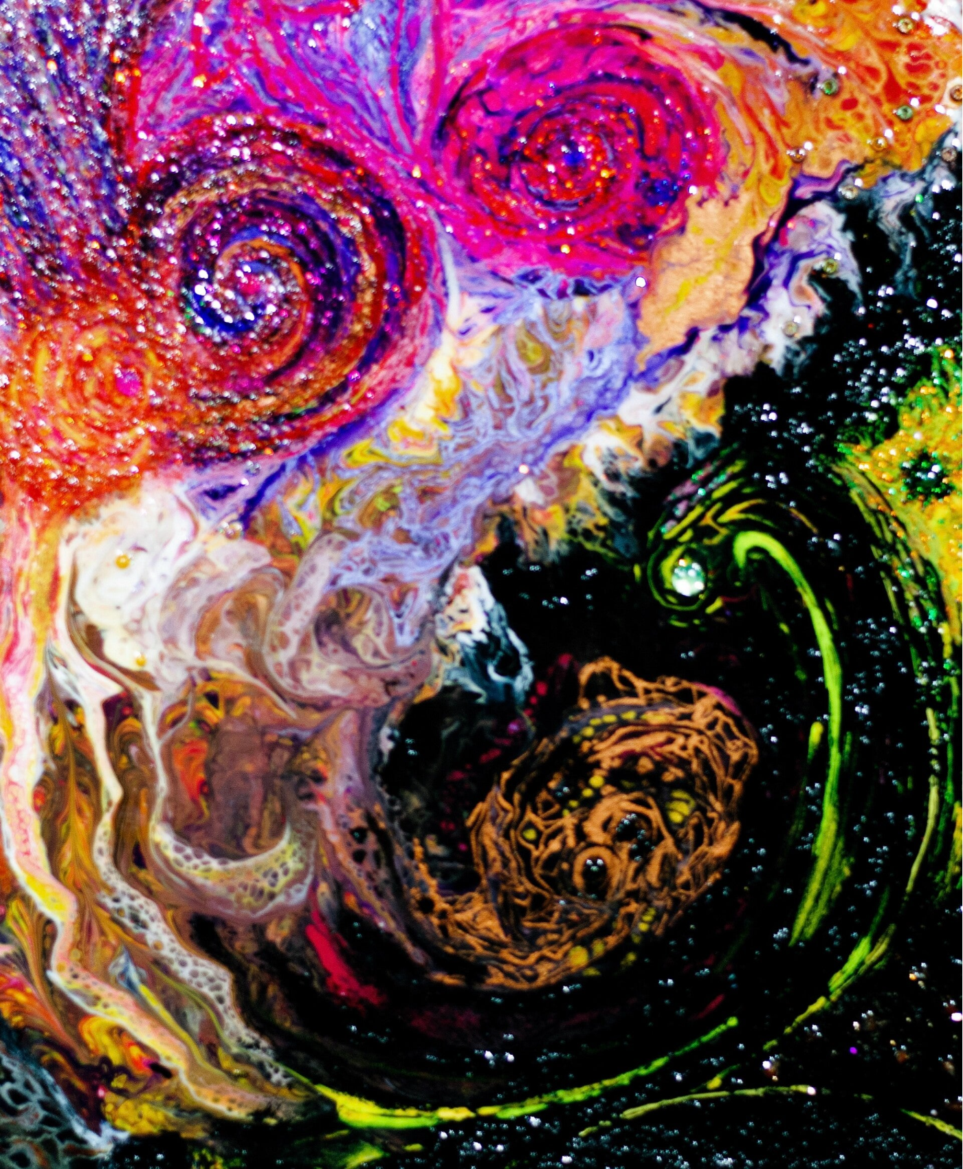 Magenta, crimson, and black intertwine - to form hypnotic spirals, evoking the beauty of swirling nebulae and galaxies in formation.